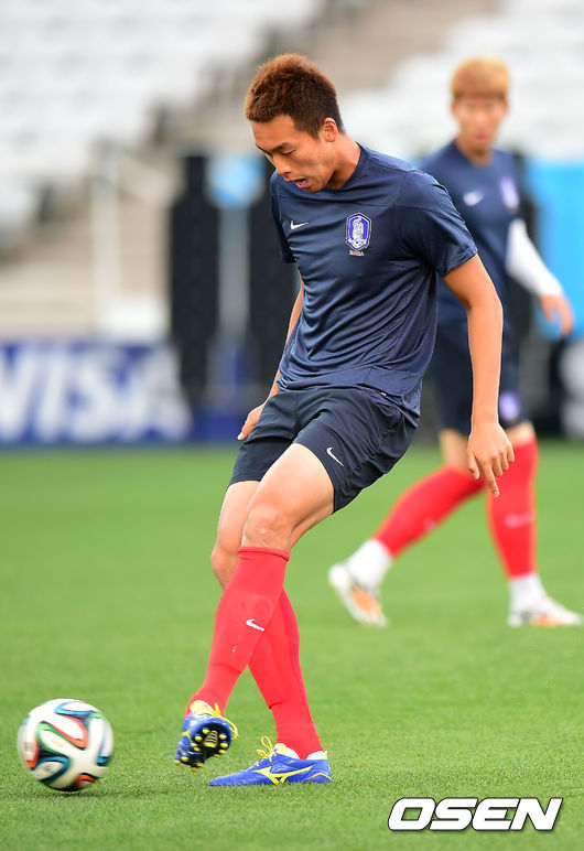 26일 오전(이하 한국시간) 홍명보 감독이 이끄는 축구국가대표팀이 브라질 상파울루의 아레나 데 상파울루 경기장에서 벨기에와의 조별리그 H조 3차전을 하루 앞두고 훈련을 가졌다. 김신욱이 그라운드 위에서 몸을 풀고 있다.