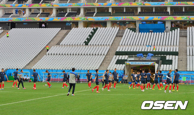 26일 오전(이하 한국시간) 홍명보 감독이 이끄는 축구국가대표팀이 브라질 상파울루의 아레나 데 상파울루 경기장에서 벨기에와의 조별리그 H조 3차전을 하루 앞두고 훈련을 가졌다. 홍명보호가 그라운드 위에서 훈련을 하고 있다.