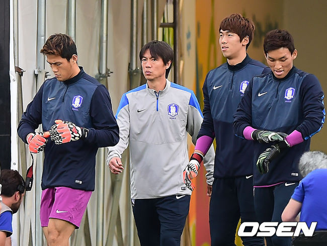 26일 오전(이하 한국시간) 홍명보 감독이 이끄는 축구국가대표팀이 브라질 상파울루의 아레나 데 상파울루 경기장에서 벨기에와의 조별리그 H조 3차전을 하루 앞두고 훈련을 가졌다. 홍명보 감독이 정성룡 김승규 이범영 골키퍼와 함께 그라운드로 나오고 있다.