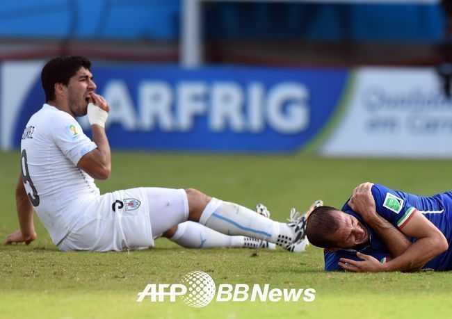수아레스는 25일(이하 한국시간) 이탈리아와의 조별리그 D조 마지막 경기에서 후반 33분경 상대 수비수인 지오르지오 키엘리니의 어깨를 물어 전 세계를 경악시켰다. 키엘리니는 즉각 주심에게 항의했으나 로드리게스 주심이 이 장면을 보지 못해 넘어갔고 결국 우루과이는 후반 36분 터진 디에고 고딘의 헤딩 결승골에 힘입어 1-0으로 이기고 16강에 진출했다.