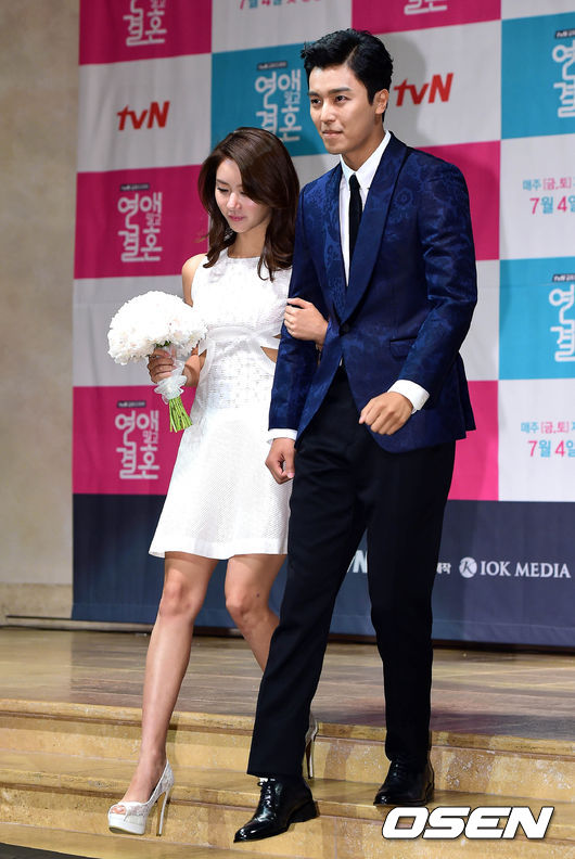 26일 오후 서울 역삼동 라움에서 열린 tvN 금토드라마 '연애 말고 결혼' 제작발표회에서 한그루, 연우진이 단상 앞에 마련된 무대로 이동하고 있다.