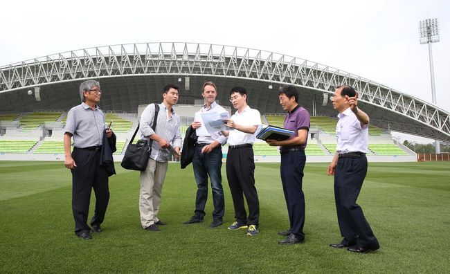 2014인천장애인AG 7인제축구 기술대표(TD)인 에바스 요하네스 앤드리커스씨가 26일 오전 남동아시아드럭비경기장을 찾아 관계자로부터 설명을 들으며 시설을 점검하고 있다.