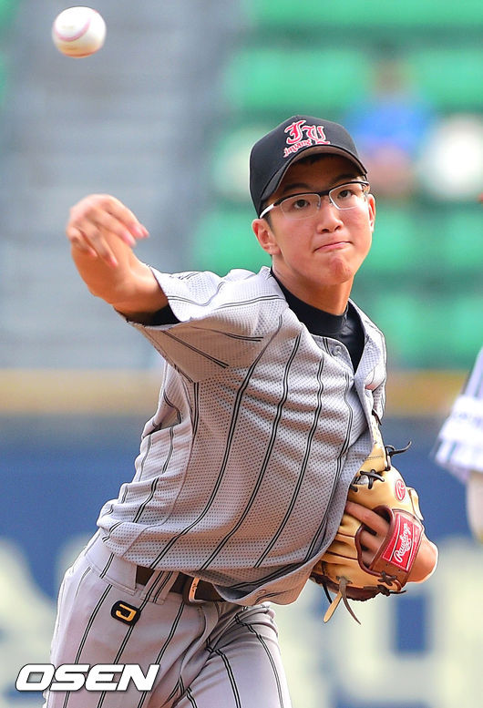 26일 오후 서울 잠실구장에서 열린 2014 한국야쿠르트 세븐 프로야구 LG 트윈스와 NC 다이노스의 경기,LG트윈스기 중학 야구대회 우승팀 자양중학교 주장 오종환이 시구를 하고 있다. 오종환은 LG 오지환의 사촌동생.