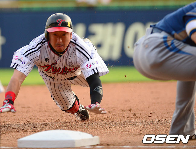 26일 오후 서울 잠실구장에서 열린 2014 한국야쿠르트 세븐 프로야구 LG 트윈스와 NC 다이노스의 경기, 2회 첫타자 LG 작은 이병규가 6구만에 3루타를 치고 슬라이딩을 하고 있다.
