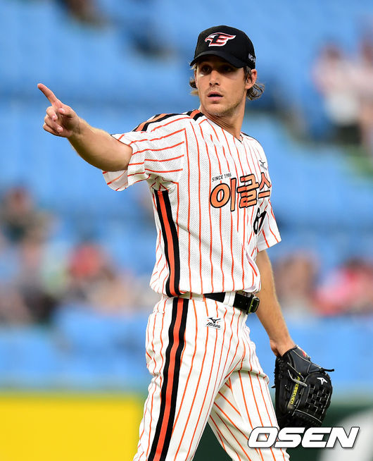 3회초 1사에서 한화 타투스코가 롯데 손아섭을 3루 땅볼로 잡고 정범모에게 사인을 보내고 있다