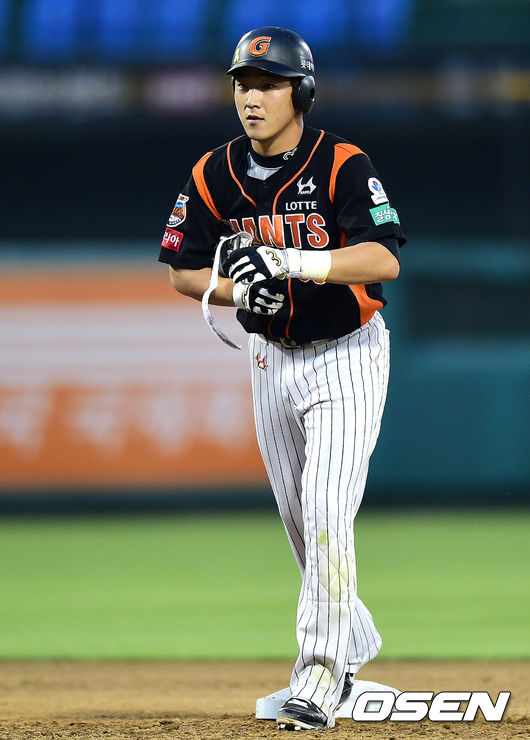 4회초 2사 1루에서 롯데 정훈이 1타점 적시 2루타를 날리고 미소짓고 있다