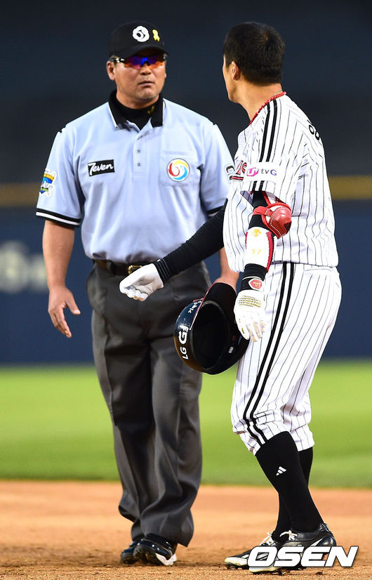 26일 오후 서울 잠실구장에서 열린 2014 한국야쿠르트 세븐 프로야구 LG 트윈스와 NC 다이노스의 경기,5회말 1사 2루 LG 임재철 내야땅볼때 1루에서 아웃판정에 강하게 어필하고 있다.