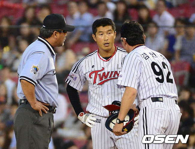 26일 오후 서울 잠실구장에서 열린 2014 한국야쿠르트 세븐 프로야구 LG 트윈스와 NC 다이노스의 경기, 5회 2사 상황 LG임재철이 1루 아웃 판정에 대해 항의하고 있다.