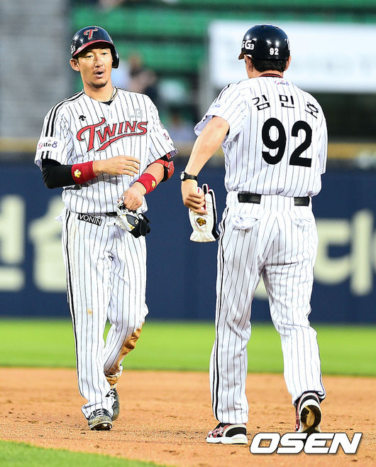 26일 오후 서울 잠실구장에서 열린 2014 한국야쿠르트 세븐 프로야구 LG 트윈스와 NC 다이노스의 경기,5회말 1사 2루 LG 손주인이 선취 1타점 적시타를 날린후 김민호 코치와 하이파이브를 하고 있다.