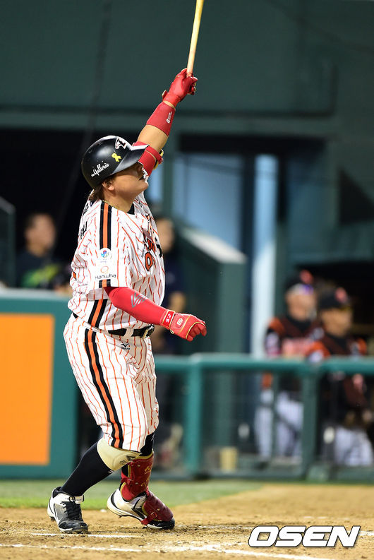 4회말 2사 1,2루에서 한화 김태균이 2타점 적시 2루타를 날리고 타구를 바라보고 있다