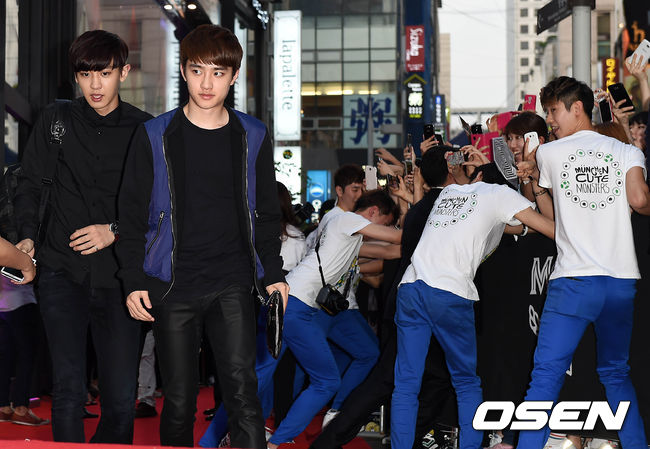 그룹 EXO가 포토월로 이동하고 있다.