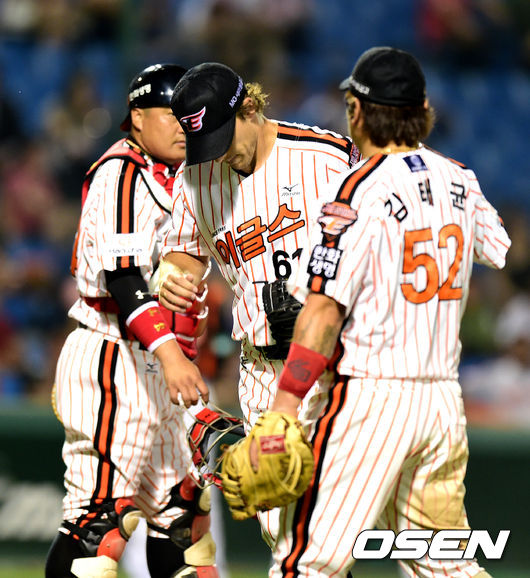 5회초 무사 1,3루에서 한화 타투스코가 강판당하고 있다