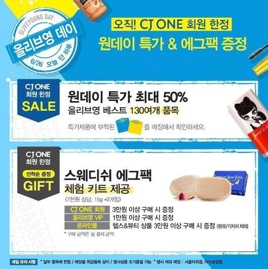 이번 올리브영데이는 CJ ONE 회원 한정으로 진행되며, ‘2014 상반기 헬스&뷰티 어워즈'에 선정되었던 올리브영 베스트 아이템 포함 130여개 품목 특가 할인이 적용된다. 또한, 올리브영 VIP 회원을 대상으로 랩피토, 사포렐, 라노립스, 보타닉힐 보 등 인기 품목 특가 혜택도 제공한다.