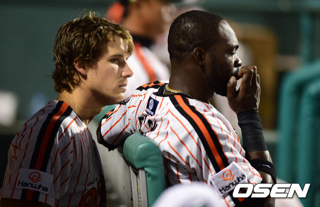 4회말 한화 타투스코와 피에가 더그아웃에서 경기를 지켜보고 있다