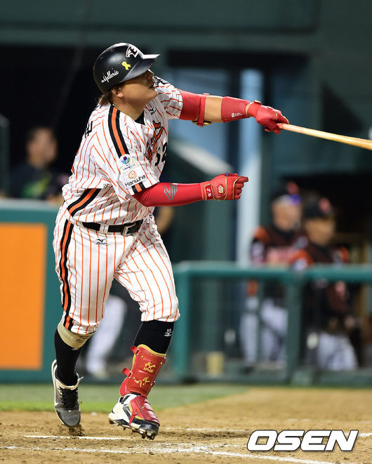 4회말 2사 1,2루에서 한화 김태균이 2타점 적시 2루타를 날리고 타구를 바라보고 있다