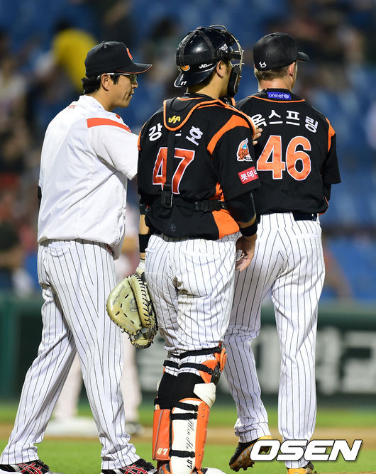 4회말 2사 1루에서 롯데 옥스프링이 강판당하고 있다