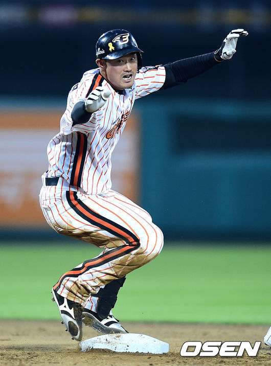 4회말 무사에서 한화 송광민이 2루타를 날리고 슬라이딩하며 세이프되고 있다