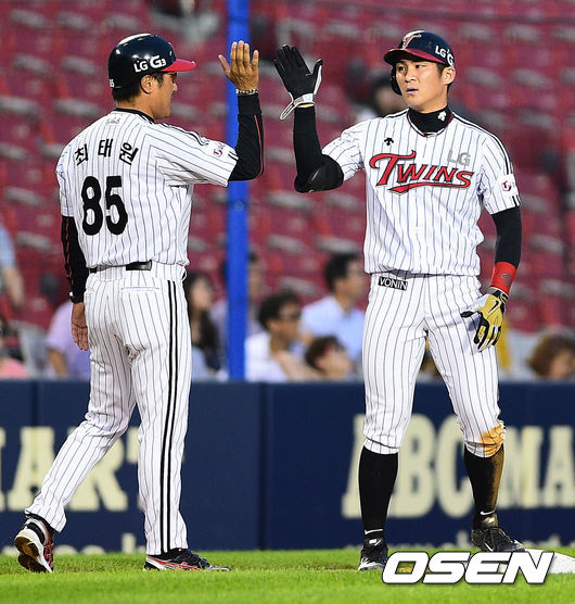 26일 오후 서울 잠실구장에서 열린 2014 한국야쿠르트 세븐 프로야구 LG 트윈스와 NC 다이노스의 경기,5회말 2사 3루 LG 오지환이 1타점 3루타를 날리고 최태원 코치와 하이파이브를 하고 있다.