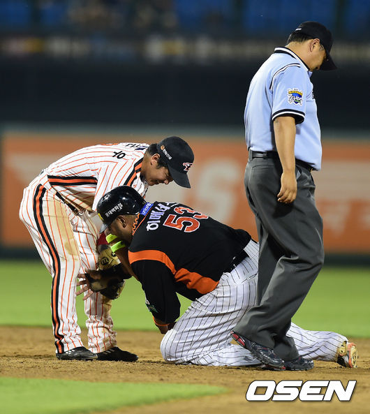 5회초 무사 1,3루에서 롯데 히메네스가 최준석의 유격수 땅볼에 한화 정근우에 포스아웃당했다. 정근우가 히메네스를 일으켜 세우며 즐거워하고 있다.
