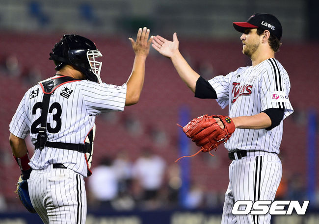 경기종료 후 완봉승을 거둔 LG 리오단이 최경철 포수와 하이파이브를 하고 있다. / soul1014@osen.co.kr