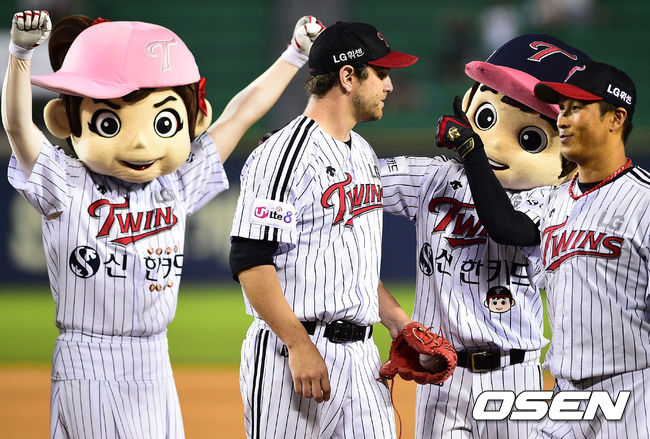 경기종료 후 완봉승을 거둔 LG 리오단이 마스코트의 축하를 받고 있다. / soul1014@osen.co.kr