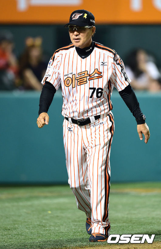 이날 한화는 김종모 1군 타격코치를 수석코치로 승격시켰다. 한화는 지난달 14일 김성한 수석코치가 자진 사퇴한 이후 수석코치 자리가 공석 중이었다. 사진은 김종모 수석코치가 8회말 구심과 이야기를 나누고 더그아웃으로 향하는 모습.