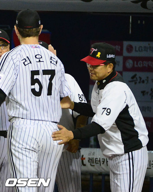 경기종료 후 LG 양상문 감독이 리오단의 엉덩이를 때리고 있다. / greenfield@osen.co.kr