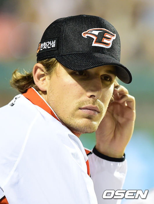7회말 한화 타투스코가 더그아웃에서 경기를 지켜보고 있다.