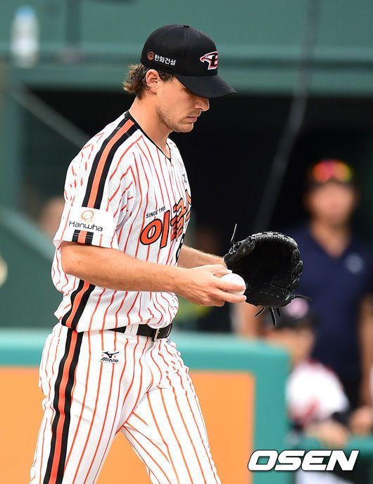 한화 새 외국인 투수 라이언 타투스코(29)의 데뷔전 승리가 좌절됐다. 호된 신고식을 치르며 한국야구의 매운 맛을 봤다.