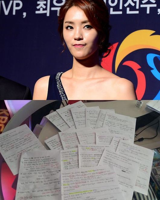 사진 속에는 정인영 아나운서가 한국 16강 진출 경우의 수를 빼곡하게 정리한 종이들이 가득해 눈길을 끈다.