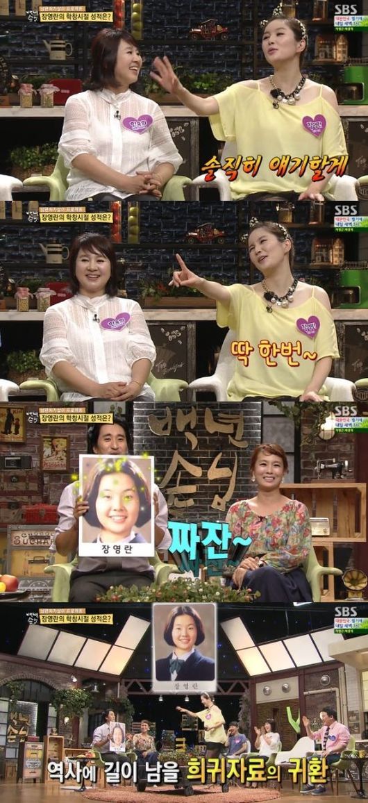 장영란은 26일 오후 방송된 SBS 예능프로그램 '자기야-백년손님'에서 학창시절 등수를 공개하라는 MC들의 요구를 받고, 대신 졸업사진이 공개돼 웃음을 자아냈다.