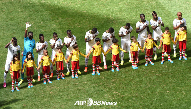 [OSEN=사진팀] 27일 새벽(한국시간) 브라질 에스타디오 나시오날 데 브라질리아서 2014 브라질 월드컵 G조 조별리그 최종전 포르투갈과 가나의 경기에 앞서 가나 선수들이 애국가를 제창하고 있다