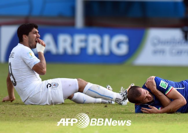 수아레스는 지난 25일 열린 우루과이와 이탈리아의 2014 브라질 월드컵 D조 조별리그에서 후반 34분 공이 없는 지역에서 이탈리아의 수비수 조르지오 키엘리니(30, 유벤투스)의 왼쪽 어깨를 물었다.