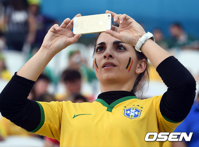 경기전 벨기에 미녀 축구팬이 휴대폰으로 촬영을 하고 있다.