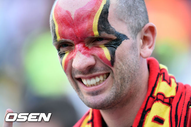 경기전 벨기에 축구팬이 열띤 응원을 펼치고 있다.