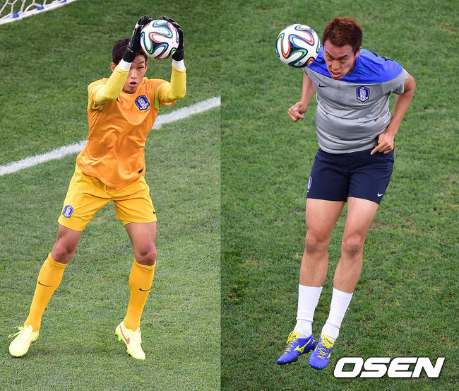 선발출장하는 김승규와 김신욱이 몸을 풀고 있다