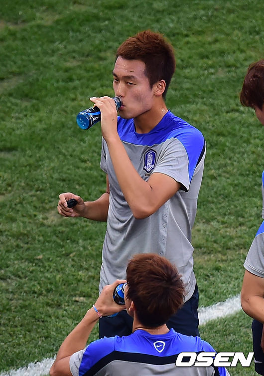 경기에 앞서 선발라인업에 포함된 김신욱이 물을 마시고 있다