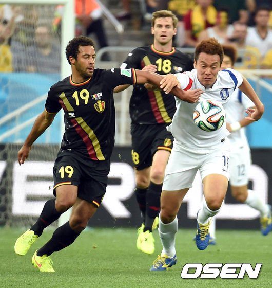 홍명보 감독이 이끄는 축구대표팀이 27일 오전(한국시간) 브라질 상파울루의 아레나 코린티아스에서 열릴 벨기에와의 조별리그 H조 마지막 경기 김신욱이 벨기에 뎀벨레와 공을 다투고 있다.