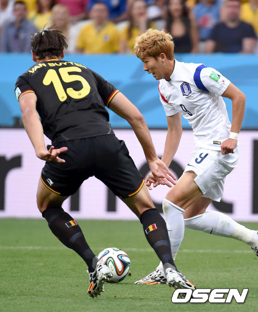 홍명보 감독이 이끄는 축구대표팀이 27일 오전(한국시간) 브라질 상파울루의 아레나 코린티아스에서 열릴 벨기에와의 조별리그 H조 마지막 경기 손흥민이 왼쪽 측면을 돌파하고 있다.