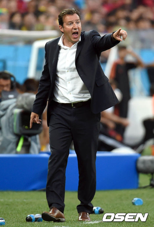 홍명보 감독이 이끄는 축구대표팀이 27일 오전(한국시간) 브라질 상파울루의 아레나 코린티아스에서 열릴 벨기에와의 조별리그 H조 마지막 경기 벨기에 빌모츠 감독이 작전지시를 하고 있다.