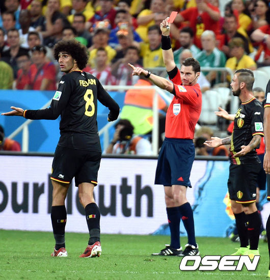 홍명보 감독이 이끄는 축구대표팀이 27일 오전(한국시간) 브라질 상파울루의 아레나 코린티아스에서 열릴 벨기에와의 조별리그 H조 마지막 경기 전반 윌리엄스 주심이 벨기에 드푸르에게 레드카드를 꺼내고 있다.