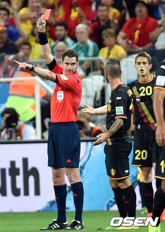홍명보 감독이 이끄는 축구대표팀이 27일 오전(한국시간) 브라질 상파울루의 아레나 코린티아스에서 열릴 벨기에와의 조별리그 H조 마지막 경기 전반 윌리엄스 주심이 벨기에 드푸르에게 레드카드를 꺼내고 있다.