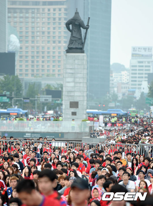 광화문 광장을 가득 메운 축구팬이 열띤 응원을 펼치고 있다.