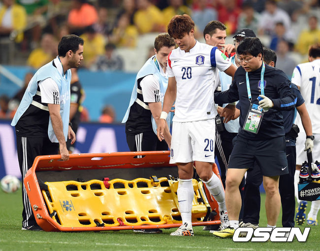 홍명보 감독이 이끄는 축구대표팀이 27일 오전(한국시간) 브라질 상파울루의 아레나 코린티아스에서 열릴 벨기에와의 조별리그 H조 마지막 경기 후반 홍정호가 공을 처리하다 부상을 당해 의료진이 들어가고 있다.