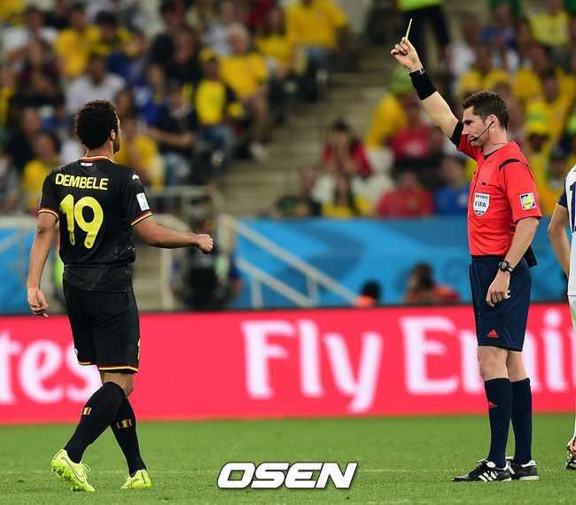 홍명보 감독이 이끄는 축구대표팀이 27일 오전(한국시간) 브라질 상파울루의 아레나 코린티아스에서 열릴 벨기에와의 조별리그 H조 마지막 경기 후반 벨기에 뎀벨레가 옐로우 카드를 받고 있다.