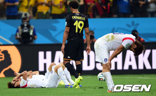 홍명보 감독이 이끄는 축구국가대표팀은 27일 새벽 5시(이하 한국시간) 브라질 상파울루 아레나 데 상파울루 경기장에서 펼쳐진 2014년 브라질 월드컵 H조 예선 마지막 경기서 벨기에에게 0-1로 무릎을 꿇었다. 이로써 한국은 1무 2패의 성적으로 H조 최하위에 머물며 16강 진출이 좌절됐다. 한국이 월드컵에서 단 1승도 못 거두고 16강에서 탈락한 것은 지난 1998년 프랑스월드컵 이후 16년 만이다.