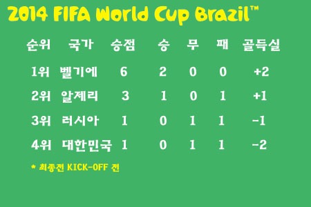 경기가 시작하기 전 한국은 16강 진출을 위한 산술적인 가능성이 남아있는 상태였다. 최종전을 남겨둔 상태에서 H조는 벨기에가 2승(득실차 +2)으로 16강 진출을 확정지었다. 조 1위냐, 2위냐의 싸움만 남아있다. 알제리가 한국전 승리로 승점 3점(득실차 +1)을 확보해 2위가 됐고 러시아와 한국이 승점 1점으로 3·4위다. 러시아는 득실차 -1로 3위, 한국은 득실차 -2로 4위다. 이래나 저래나 알제리전 패배가 뼈아플 수밖에 없다.