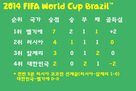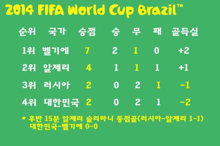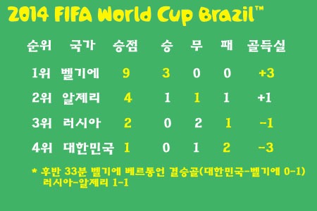 마지막까지 희망의 끈을 놓지 않고 벨기에의 골문을 두들기던 한국은 후반 33분 얀 베르통언의 골로 0-1이 되면서 사실상 16강 진출의 꿈이 무너졌다. 결국 득점 없이 벨기에에 패한 한국은 1무 2패(승점 1, 골득실 -3)로 조 최하위를 기록하며 월드컵 무대에서 퇴장했다. H조는 벨기에가 3전 전승으로 1위, 알제리가 1승 1무 1패(승점 4, 골득실 +1)로 2위에 올라 16강에 진출했다.