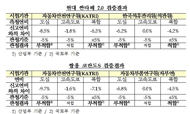 정부는 26일, 현대자동차 ‘싼타페 2.0’과 쌍용자동차 ‘코란도S’에 대한 연비 재검증 결과를 발표했다. 그러나 국토교통부와 산업통상자원부가 같은 사안을 놓고 각기 다른 결론을 내림에 따라 소비자 혼란만 가중시키고 있다.