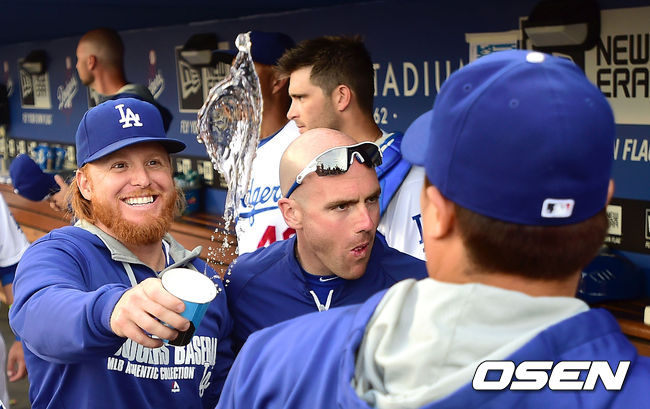 다저스 터너가 류현진에게 장난을 치고 있다.